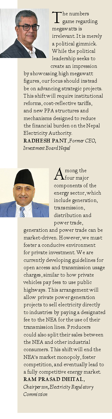Hydropower experts are concerned about the financial health of the Nepal Electricity Authority, the sole power off-taker, while it signs PPAs without first stimulating domestic power demand. “The numbers game regarding megawatts doesn’t matter. This is merely a political gimmick. The political leadership wishes to create an impression by showcasing high megawatt figures, but our focus should be on advancing strategic projects,” according to Radhesh Pant, Former CEO of Investment Board Nepal. “This will require institutional reforms, cost-reflective tariffs, and new PPA structures and mechanisms to reduce the financial burden on the NEA.”