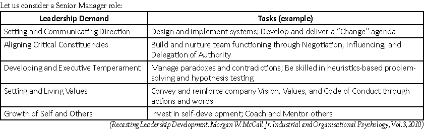 A: Leaders have five demands placed on them: Setting and Communicating Direction; Aligning Critical Constituencies; Developing an Executive Temperament; Setting and Living Values; and Growth of Self and Others. These demands are common across managerial levels, the specific tasks, and their intensity, that the leaders will perform will, of course, vary depending on whether it is a junior, middle, or senior level. And the demands are common across functions – HR, Marketing, Finance, Supply Chain, etc.