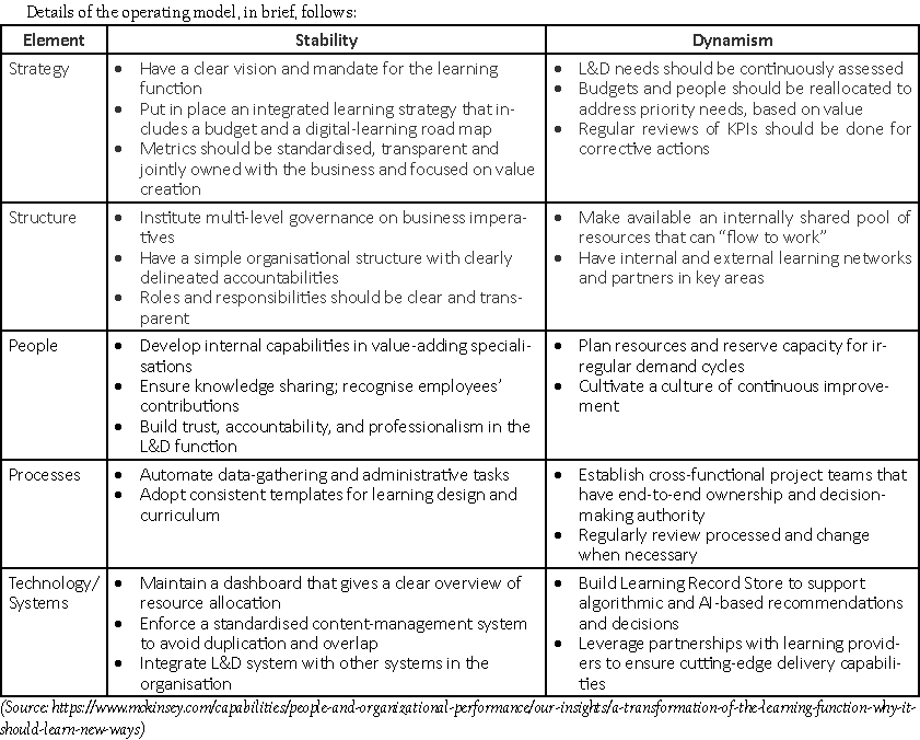Before considering any operational changes, the organisation should set or review the L&D vision and ensure that it is linked to its strategic priorities. Second, an assessment should be made of the current capabilities and readiness for change of the L&D function to determine appropriate interventions and priorities. Then comes designing the operating model, striking a balance between stability and dynamism, to consider strategy, structure, people, processes, and systems for the L&D function.