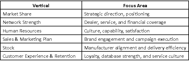 Each of these six strategic verticals plays a critical, interconnected role in running a successful automobile business: