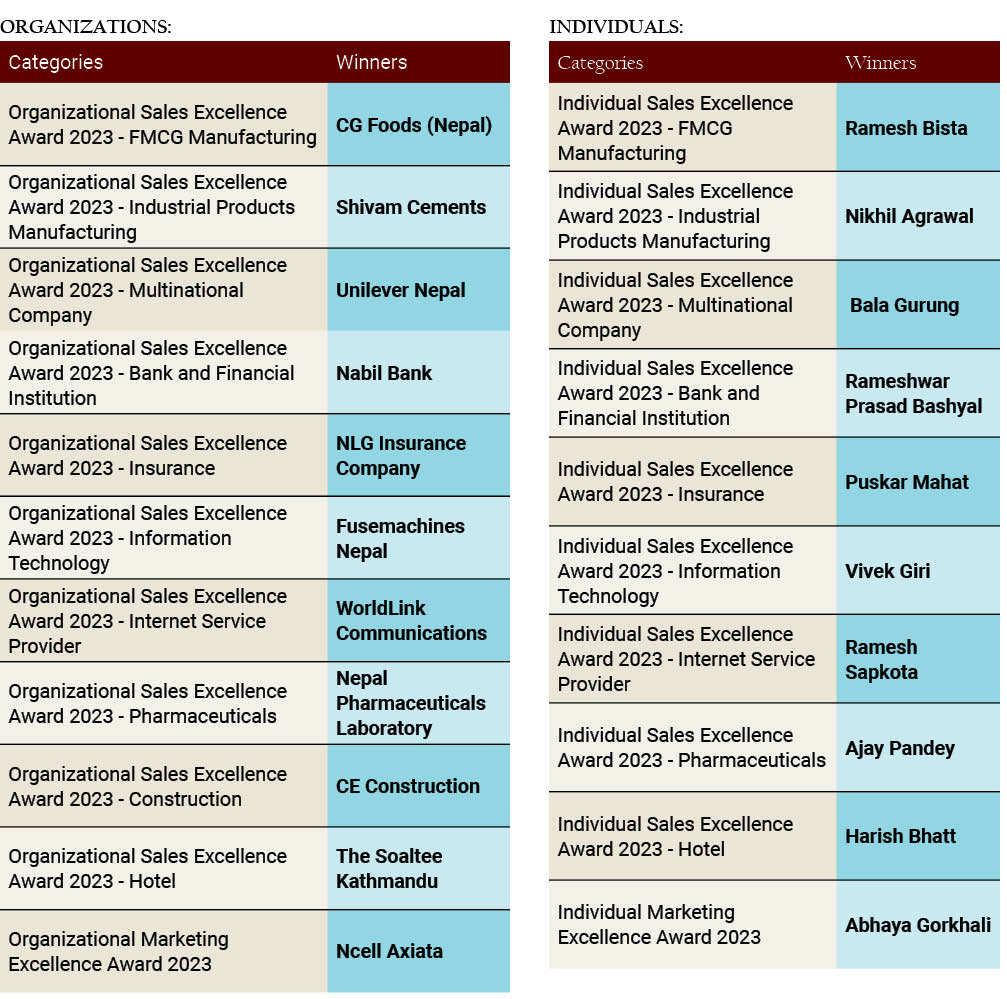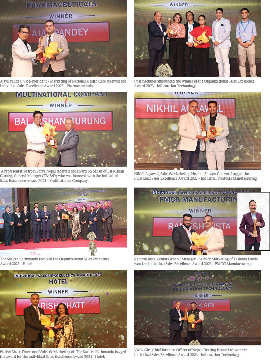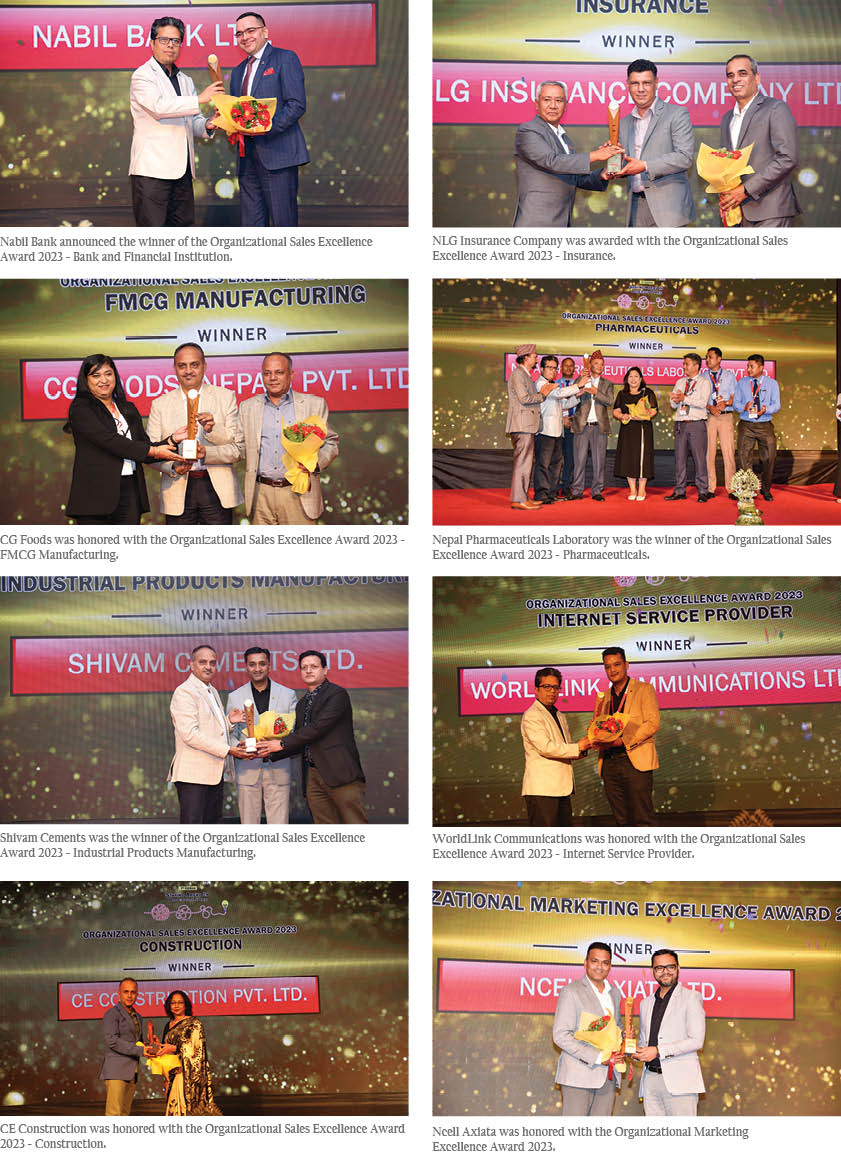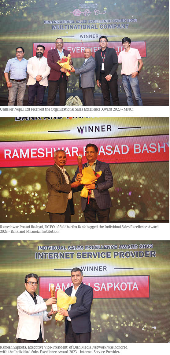 The Sales Summit 2023 concluded with a glittering award ceremony that celebrated excellence and innovation in the fields of sales and marketing. A total of 11 outstanding organizations and 10 individuals were honored with the Sales and Marketing Excellence Awards for their exceptional contributions to the industry. The winners were chosen after a rigorous evaluation process, reflecting their dedication, innovation, and impact on the industry. An eminent jury, comprising esteemed academicians selected the deserving recipients of the awards. The jury meticulously evaluated the nominations based on data and information furnished by an independent research firm. The jury included Dr. Binod Krishna Shrestha, Professor, School of Management, Kathmandu University as Jury Head and Ashish Tiwari, Director & Principal, Ace Institute of Management, and Binita Manandhar, Lecturer at Shanker Dev Campus as jury members.